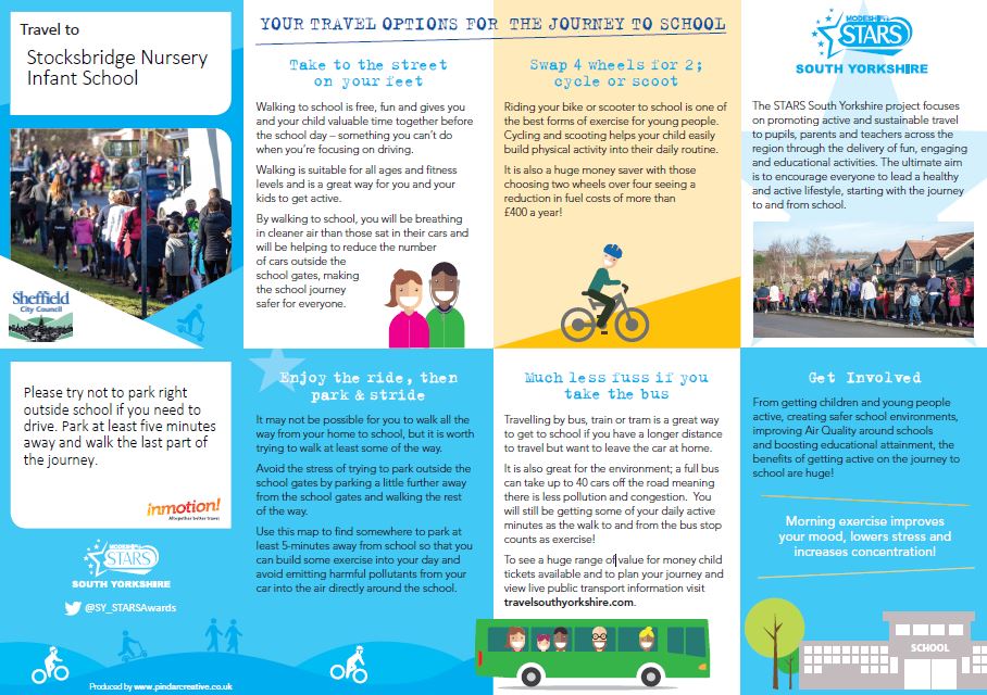 - We promote safe and active travel as much as possible by using our noticeboard, displays, newsletter and website at https://www.stocksbridgenurseryinfants.co.uk/